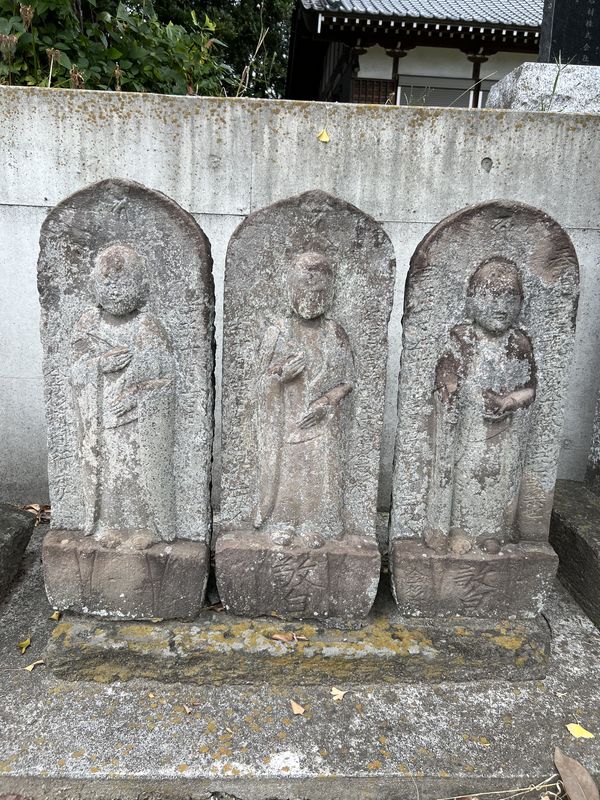 続いては六地蔵。三基ずつ二箇所にまとめられている。六基とも江戸中期・享保17年(1732)10月造立。石塔型式は舟型。石塔の最頂部に地蔵菩薩を表わす梵字「カ」。中央に地蔵菩薩立像が浮き彫りされている。
